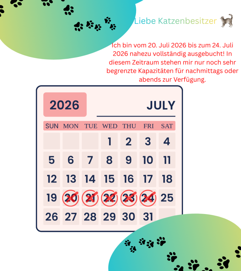 Ich empfehle Ihnen, frühzeitig einen Termin zu vereinbaren, um sicherzustellen, dass ich für Ihre geliebten Katzen da sein kann.