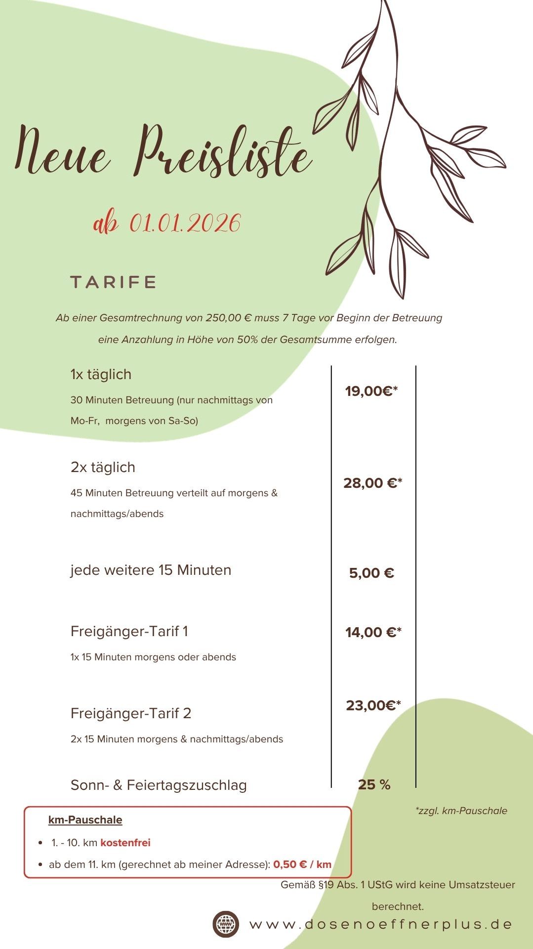 Preisliste und Zahlungsmodalitäten