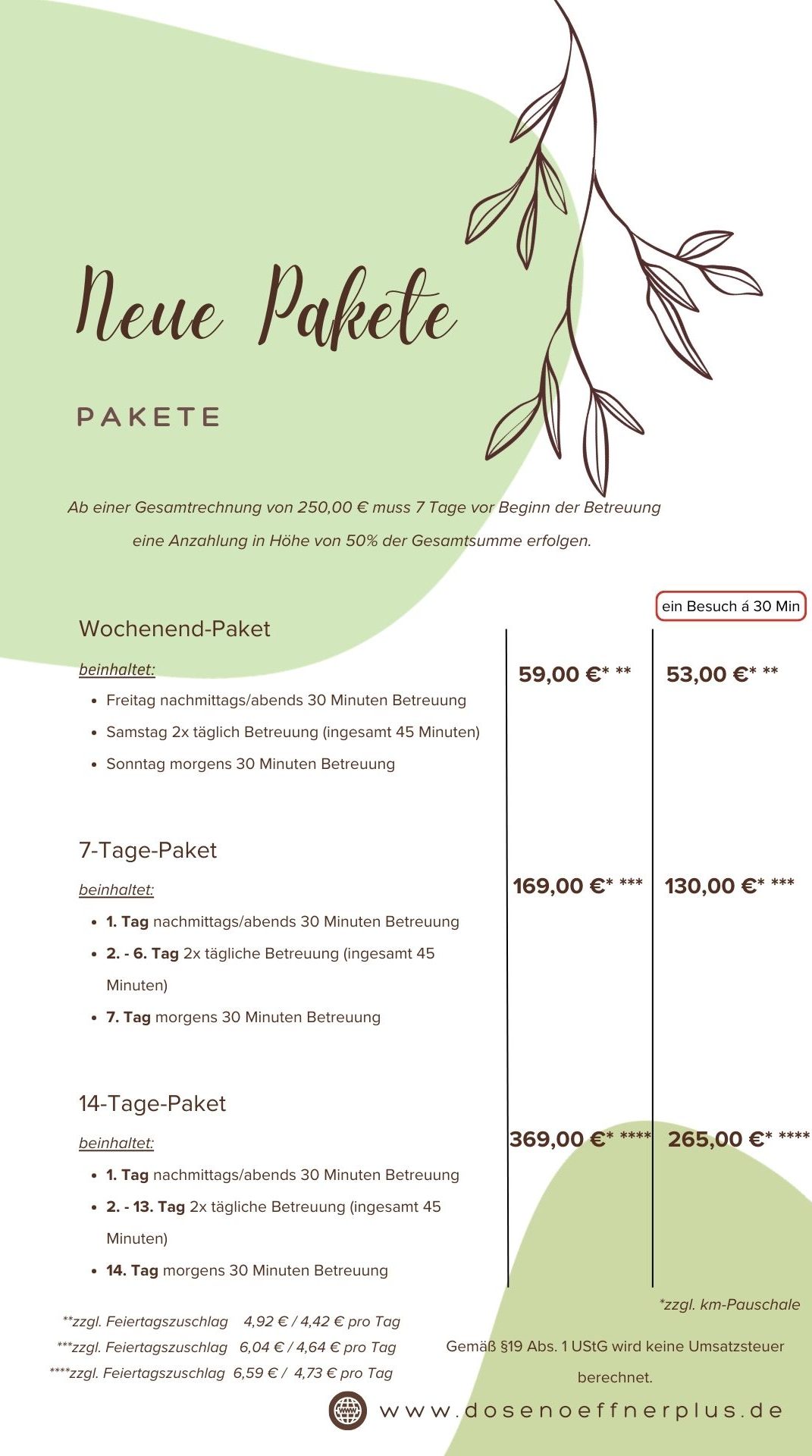 weniger als 48 Stunden vor Betreuungsbeginn: 50 % der vereinbarten Betreuungskosten